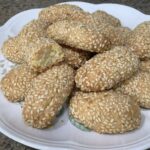 - Whisk the egg whites with water, dip each dough segment into the wash, roll thoroughly in sesame seeds, and bake on a lined tray for 25 minutes until golden brown.