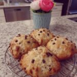A stack of thick chocolate chip cookies in a vintage kitchen setting